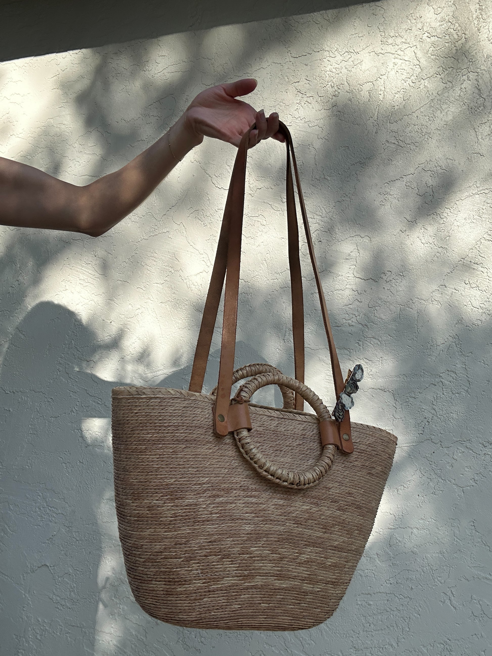 From the line of Mercado baskets, the mid-sized tote canasta is perfect for everyday adventures. It features over-the-shoulder leather straps as well as round handles for multiple carrying options.
